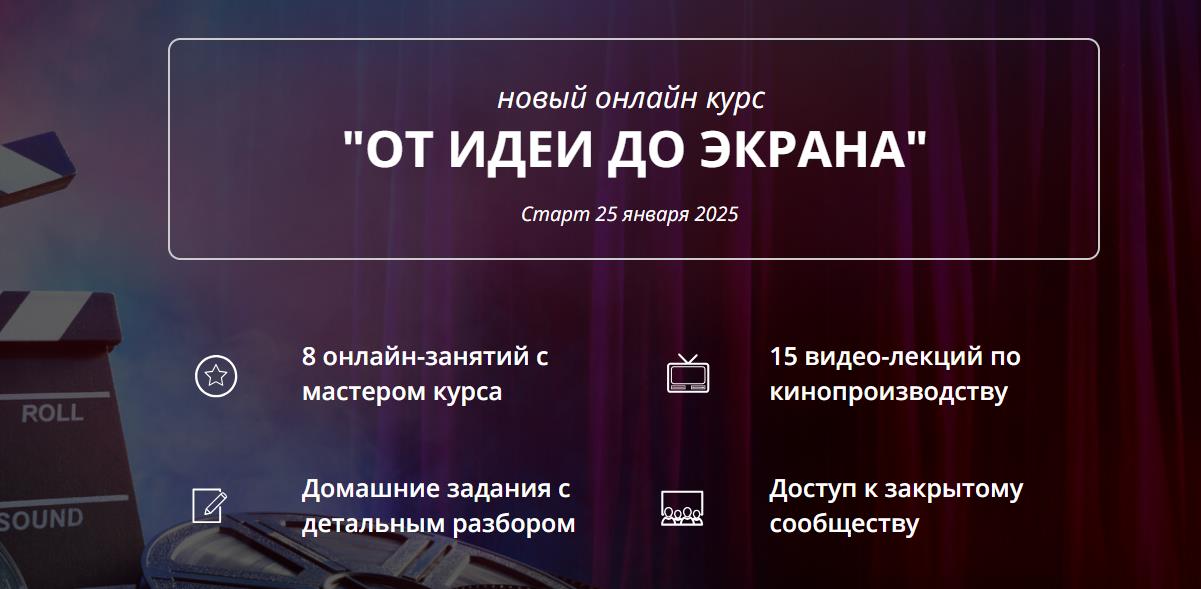 • 15 видео-лекций по основам кинопроизводства. Доступ к эксклюзивным материалам от лучших кинорежиссеров страны.